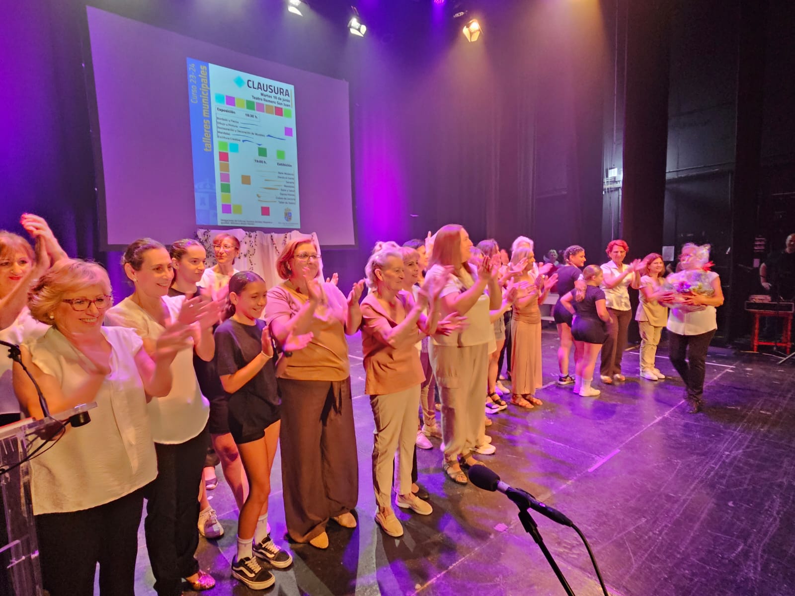 El Teatro Romero San Juan acogió el cierre de la temporada de los talleres de la temporada 23-24. Sobre el escenario el grupo de baile bajo la dirección de Elisa Castellano en los talleres de baile y salud, baile moderno y baile urbano, las poesías de Tere, Paqui, Pilar, Justa y Rosa, el taller de Teatro con Rafael Jiménez Foncubierta con una fragmento de Sanjuaneando con Maria del Carmen y Rosario y las poesías de los jóvenes Jorge García y Martina Casado y los vídeos resumen de instantáneas de todo el año de los talleres de restauración, pintura, Biblioteca, Igualdad, Salud y Mayores.