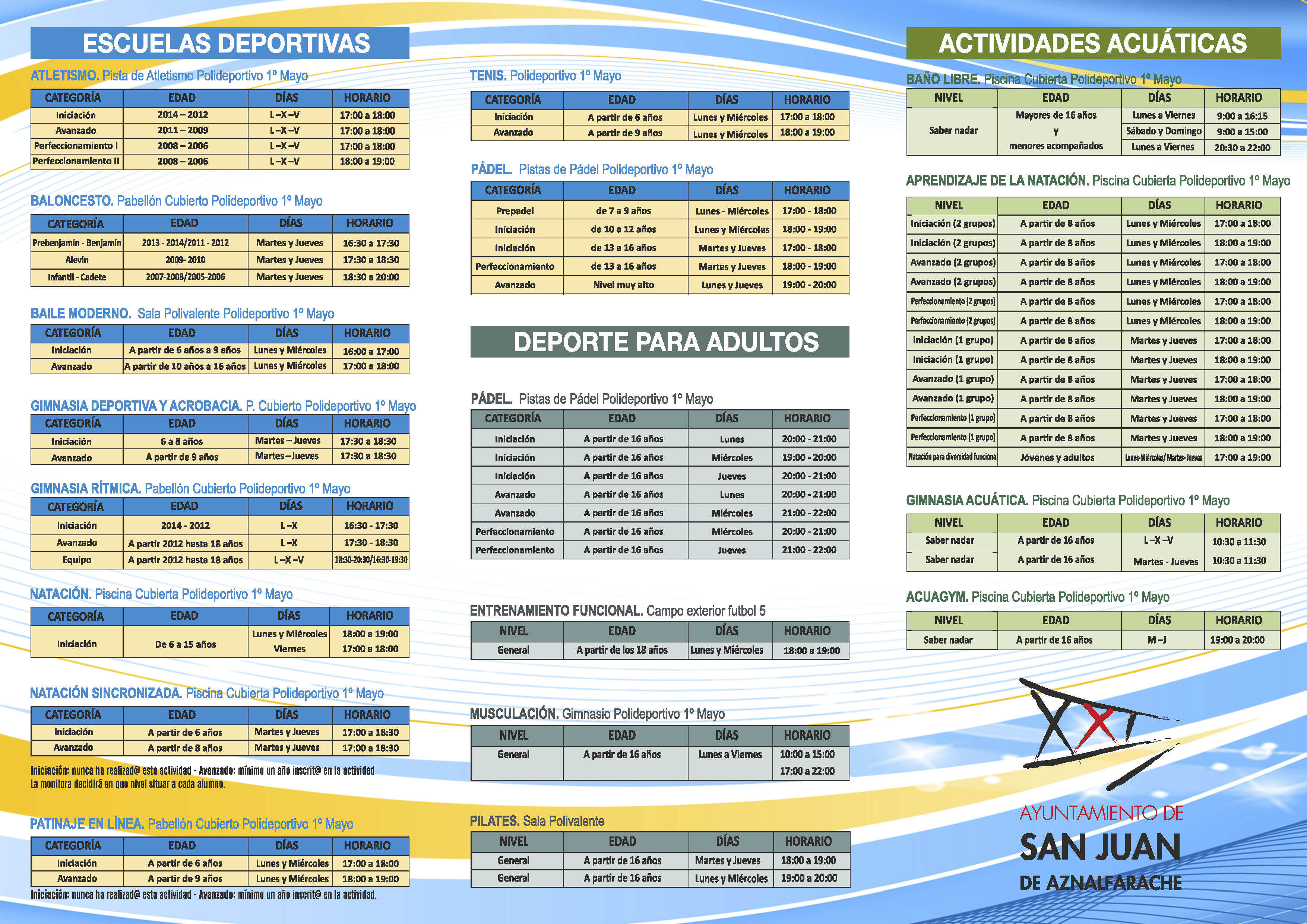 El Ayuntamiento de San Juan de Aznalfarache oferta a la ciudadanía un total de 10 escuelas y 8 actividades deportivas en la temporada 2020-2021. La delegación de Deportes abrirá el plazo de inscripción en las diferentes actividades y escuelas deportivas entre el 28 y el 30 de septiembre para socios, personas empadronadas o que hayan estado inscritas en actividades de la temporada 2019-2020 al menos un trimeste. A partir del 1 de octubre se abrirá el plazo para el resto de interesados. El inicio de las actividades está previsto para el día 5 de octubre.