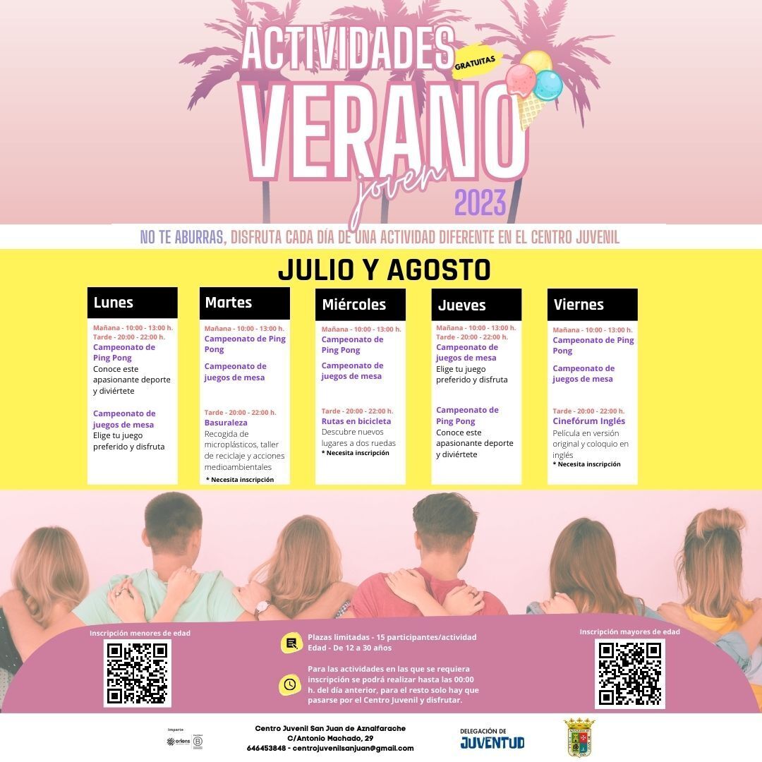 El centro estará abierto todas las mañanas de 10:00 a 13:00 y los jóvenes que lo deseen pueden acudir para participar en Campeonatos de ping pong o disfrutar de partidas de los diversos Juegos de mesa disponibles en las instalaciones. Ninguna de estas actividades requiere una inscripción previa, solo acudir al centro juvenil con ganas de participar.