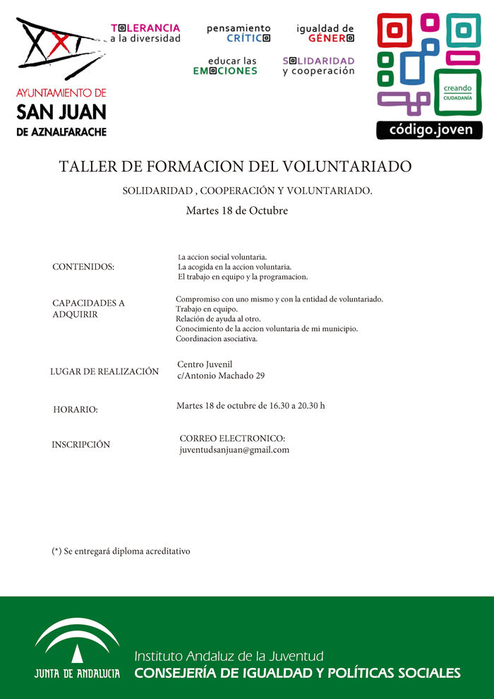 Para participar este tarde hay que remitir un email a juventudsanjuan@gmail.com indicando el deseo de acudir al taller. La actividad está dirigida a jóvenes de 14 a 30 años. Está prevista la entrega de un diploma acreditativo a los participantes. Se trata de una formación organizada por el Instituto Andaluz de la Juventud dentro del programa Código Joven en la que colabora el Ayuntamiento de San Juan de Aznalfarache a través de las delegaciones de Juventud y Voluntariado.