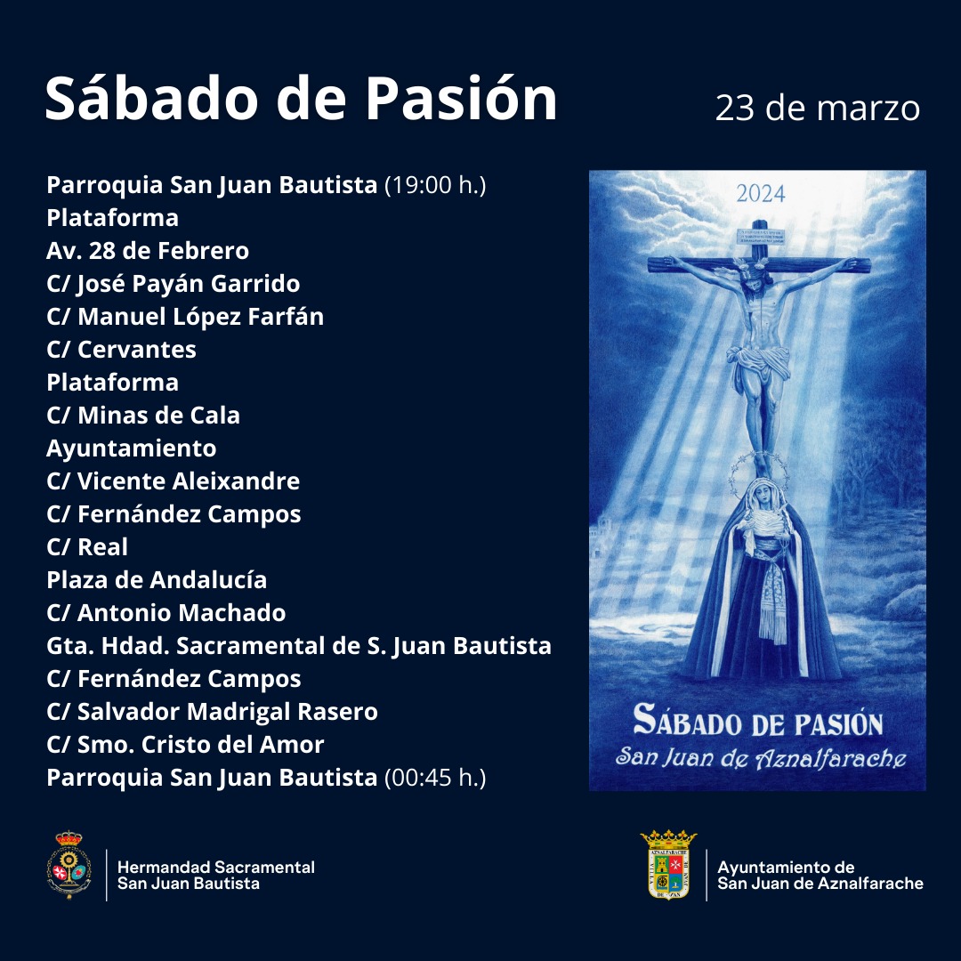 La hermandad sacramental de San Juan Bautista saldrá a las 19:00 horas desde su parroquia y su recorrido será el mismo que los últimos años a excepción de su paso por Conde de Barcelona que al estar cortada por obras se dirigirá por la 28 de Febrero directamente a la calle Payán Garrido.