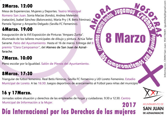 Los actos conmemorativos comienzan el próximo jueves 2 de marzo con la mesa de experiencias "Mujeres y Deportes" que se desarrollará en el Teatro Romero San Juan. La programación incluye también la exposición de Pinturas "Amparo Zurita", un pleno infantil, un triangular de fútbol femenino y unas jornadas sobre empleadas de hogar y cuidadoras.