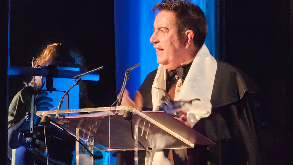 Un escenario futbolero, un tipo de jefe de los ultras del Carnaval, muy chirigotero, y una afición rendida que no paró de corear al pregonero durante los aproximadamente 60 minutos que duró el acto. Durante ese tiempo, Manolo Carlos repasó sus iconos en el mundo del Carnaval, como Manolo Santander y su himno no oficial del Cádiz, que sonó en la voz de un carnavalero sanjuanero como "El Gata"; con Martínez Ares, al que hizo un guiño ya en el primer saludo sobre el escenario; o con Juan Carlos Aragón «y creo en la vida eterna de los Carnavales...», una pasión contagiada por María José, «detrás de una gran mujer, ahí estoy yo».
