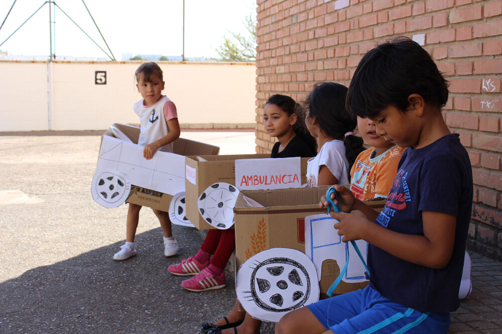 Esta semana, la quinta de funcionamiento del programa han trabajado la seguridad vial y tras recordar las señales de tráfico más importantes, sobre todo a los más pequeños, de 4 y 5 años, salieron al patio del centro donde hay dibujado un circuito para poner en práctica sus conocimientos. Habían preparado vehículos, realizados en cartón para los más pequeños, mientras que los mayores (6-8 y 9-12 años) pudieron llevar sus patinetes para circular.