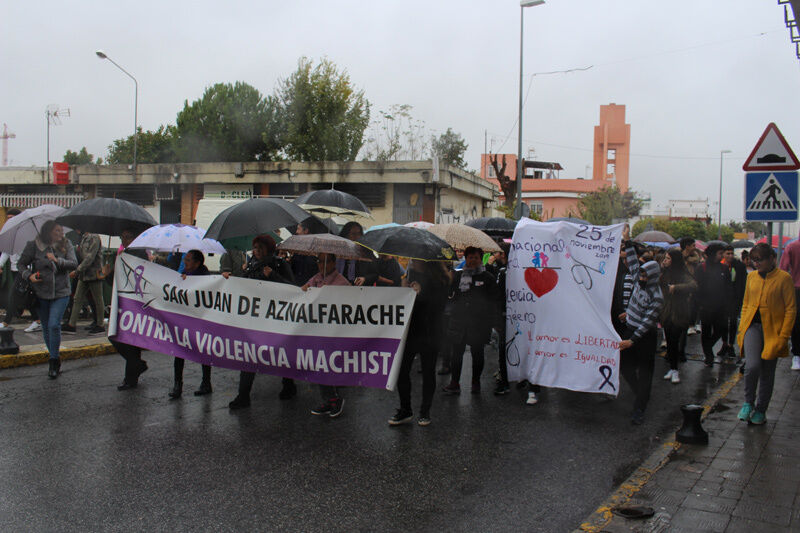 Cientos de estudiantes de San Juan de Aznalfarache protagonizaron la IV Marcha Contra la Violencia de Género organizada por el Ayuntamiento. Vecinos y vecinas de la localidad y responsables políticos municipales también se sumaron a la marcha que partió a las 12:00 horas de la plaza Angelita Vargas y culminó en el pabellón de la barriada Santa Isabel donde se celebró el acto central.