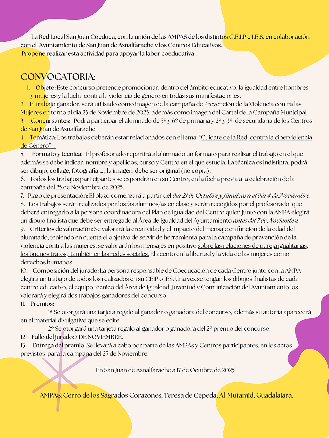 El concurso, que organizan las AMPAs de los Centros Educativos integradas en la Red Local San Juan Coeduca, se dirige exclusivamente al alumnado de los centros educativos de San Juan de Aznalfarache, concretamente de 5º y 6º de Primaria y 1º y 2º de Secundaria. La imagen ganadora ilustrará el material divulgativo que se distribuirá desde el Ayuntamiento. Los trabajos deberán realizarse dentro de la temática de la ciberviolencia de género.