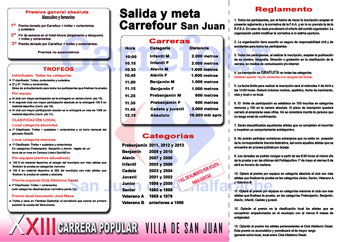 10 pruebas en las diferentes categorías conforman la XXIII edición de la Carrera Popular Villa de San Juan. Prebenjamín, benjamín, alevín, infantil en las categorías de femenino y masculino, más la prueba para cadetes y juvenil y la absoluta en la que cada año compiten unas 700 personas por las calles de San Juan de Aznalfarache. El recorrido será el habitual, sin cambios, con la tradicional subida de la barriada del Monumento a falta de poco más de dos kilómetros para alcanzar la meta, situada, al igual que la salida, en el aparcamiento del Centro comercial Carrefour de la localidad.