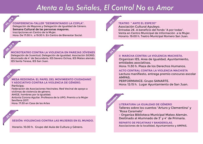 El acto central de la campaña por el Día contra la violencia machista tendrá lugar el 24 de noviembre con una marcha en la que participaran los centros de educación secundaria de la locales. Se trata de la II edición de esta marcha que partirá de la Plaza de los Derechos Humanos a las 11:30 para concluir en el Ayuntamiento de San Juan de Aznalfarache, donde se desarrollará el acto. Además de los IES participan también en la organización varios colectivos de la localidad.