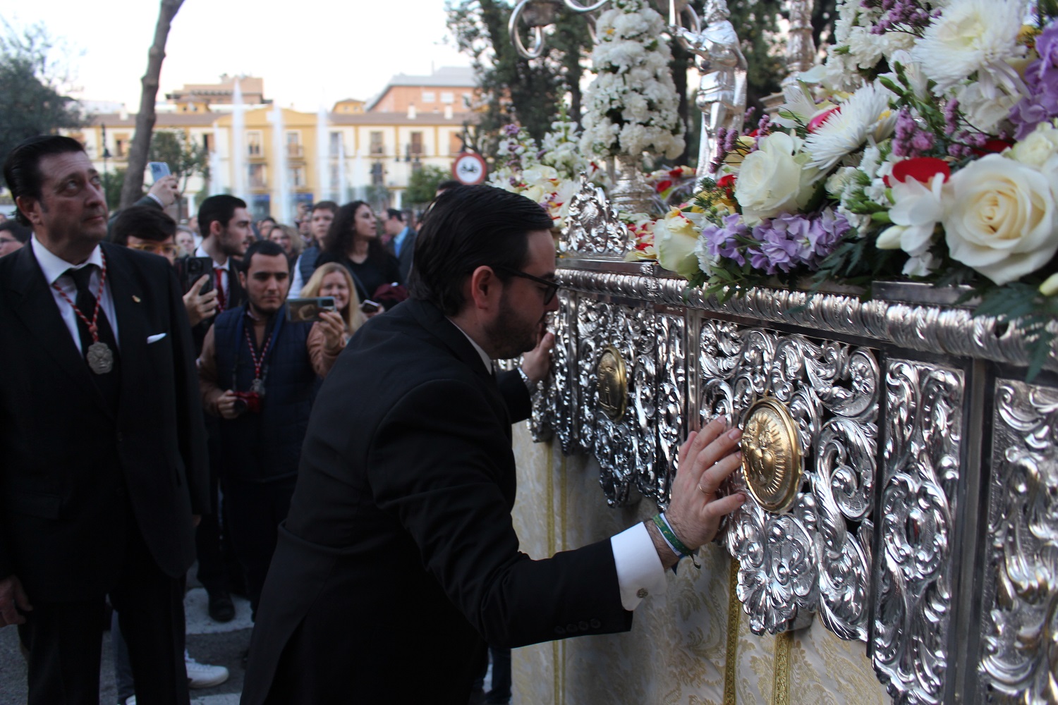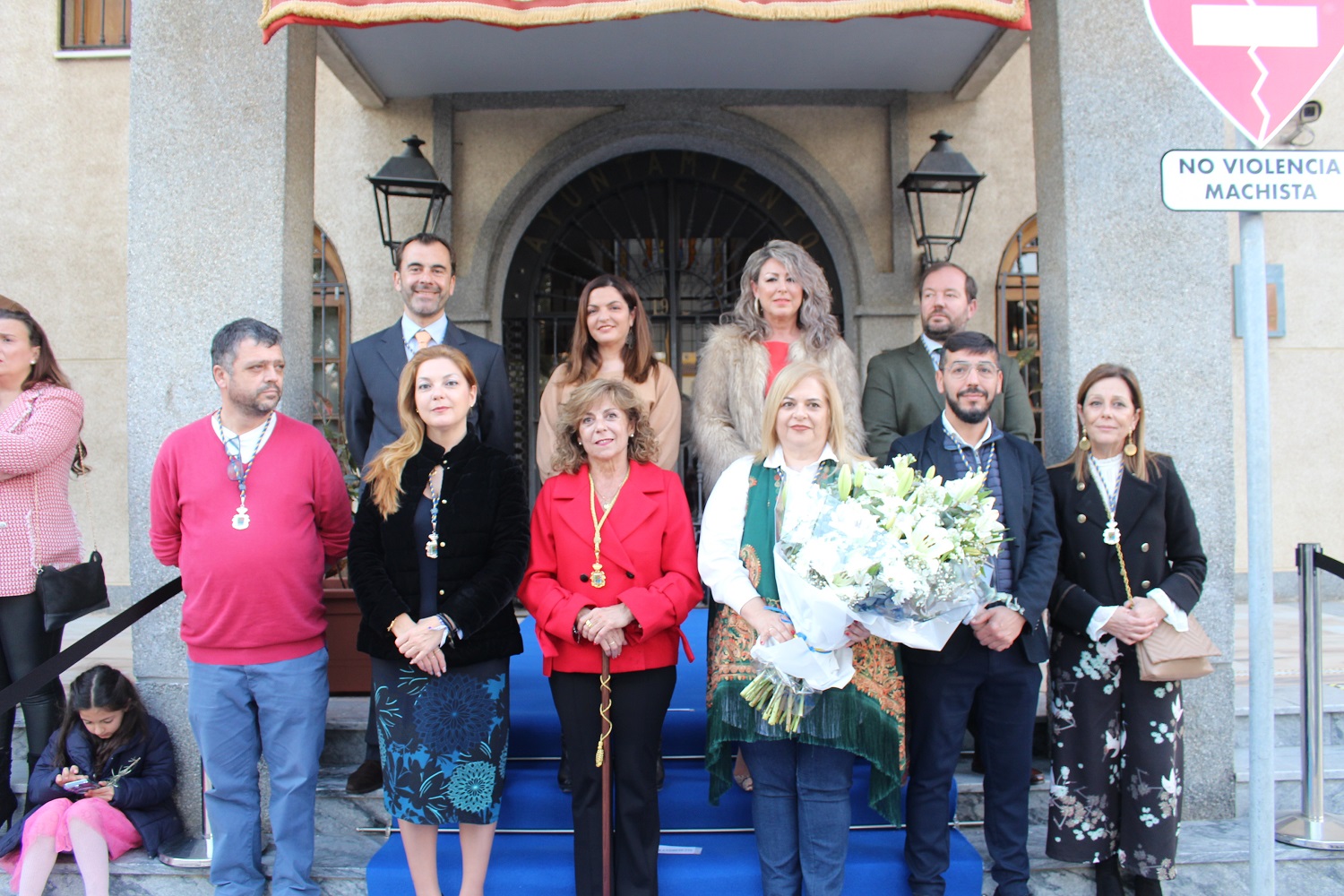 Miembros de la Corporación municipal recibieron a la patrona a las puertas del Ayuntamiento donde se realizó una ofrenda floral que fue entregada por la alcaldesa, Mª Luisa Moya, al hermano mayor de la Hermandad Sacramental de San Juan Bautista, Fernando Paz.
