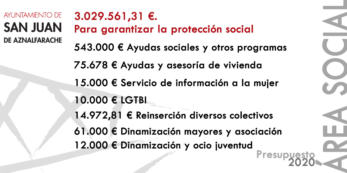 El escenario que se dibuja en el año 2020 tras el Estado de Alarma obliga a las administraciones locales a realizar un esfuerzo añadido al que venían realizando en los últimos años. El Ayuntamiento de San Juan de Aznalfarache asume en los presupuestos para este ejercicio esta responsabilidad con un crecimiento de casi el 28% en las diversas partidas de ayudas social.