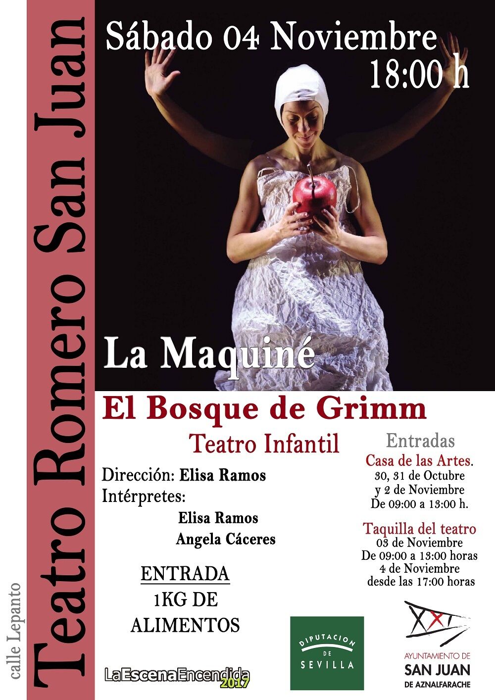 Las invitaciones se pueden recoger, a cambio de un kilo de alimentos, en la Casa de las Artes hasta este jueves 2 de noviembre de 9:00 a 13:00 horas. El viernes 3 de noviembre en el taquilla del teatro en el mismo horario, y el sábado también en taquilla, desde una hora antes del comienzo de la obra.