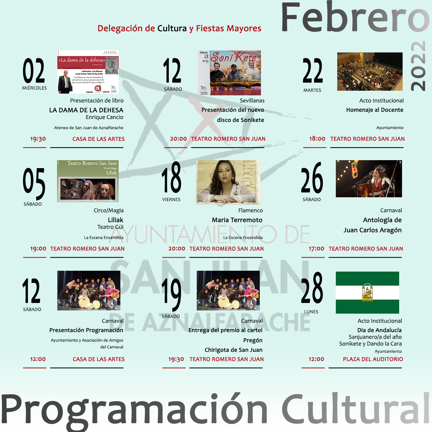 La programación se cierra en febrero con una de las citas imprescindibles de cada año, la celebración del Día de Andalucía en la Plaza del Auditorio con la entrega del galardón al sanjuanero/o del año 2021 y la actuación de los grupos locales Sonikete y Dando la Cara.