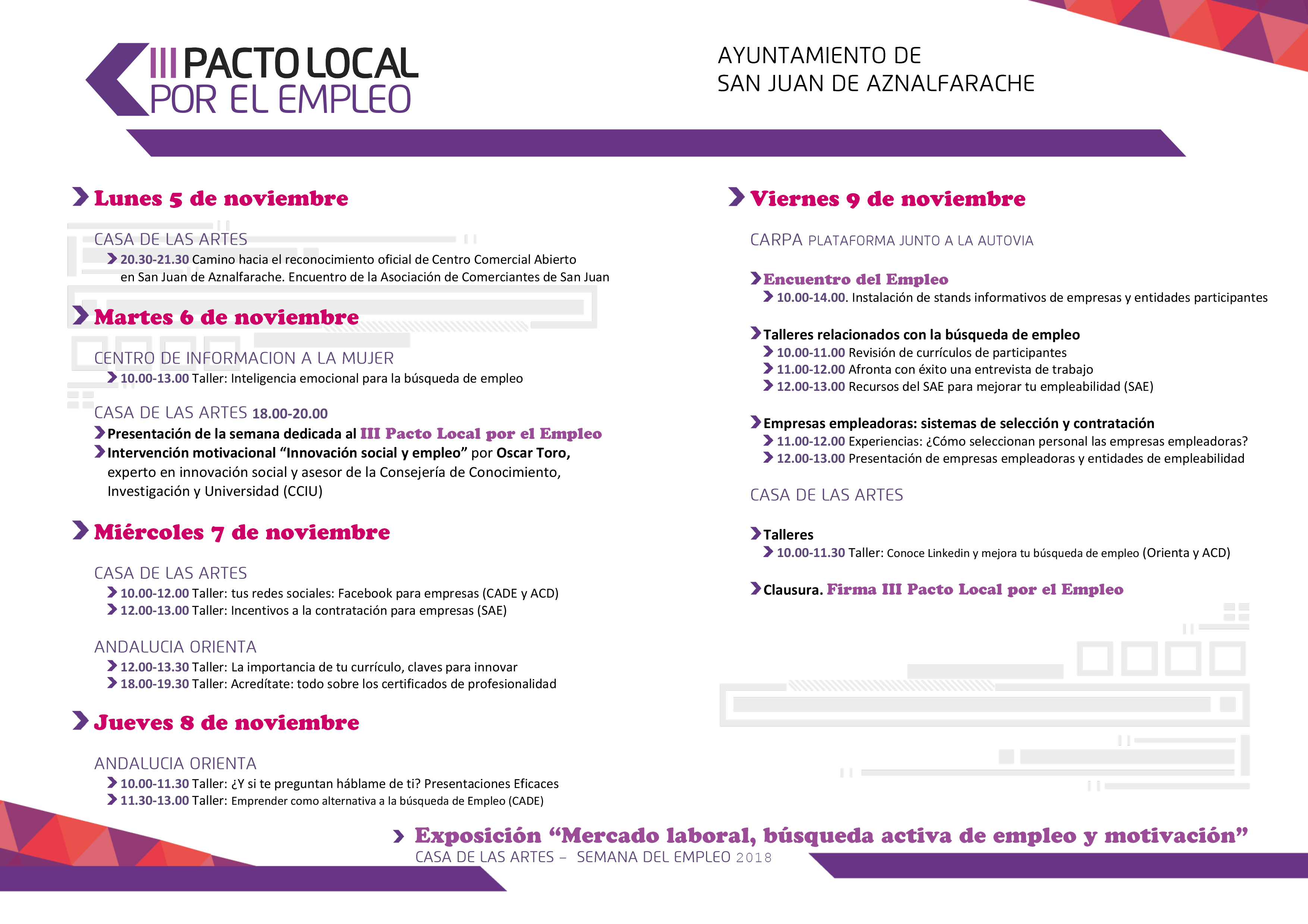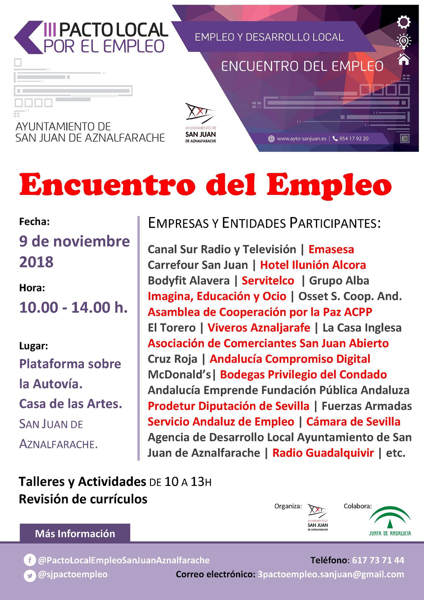 A las 13:30 se firmará el documento del III Pacto por el Empleo en un acto que tiene previsto contar con la presencia del Secretario General de Empleo de la Junta de Andalucía, Manuel Caballero, el  director general de Políticas Activas de Empleo del SAE, Rafael Moreno y el alcalde de San Juan de Aznalfarache. Además, estarán presentes los representantes de las 15 empresas que en esta edición se sumarán a este documento.