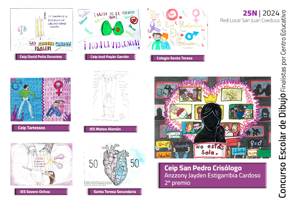 Todos los centros educativos de San Juan de Aznalfarache han participado en esta duodécima edición del Concurso escolar de imágenes para la prevención y sensibilización sobre la violencia de Género. El concurso está organizado por los centros educativos, las AMPAS y la Delegación de Igualdad del Ayuntamiento de San Juan de Aznalfarache. El dibujo ganador ilustrará la pegatina que se reparte con motivo de la conmemoración del Día Internacional para la Eliminación de la Violencia contra las Mujeres, así como la campaña de sensibilización del Ayuntamiento.