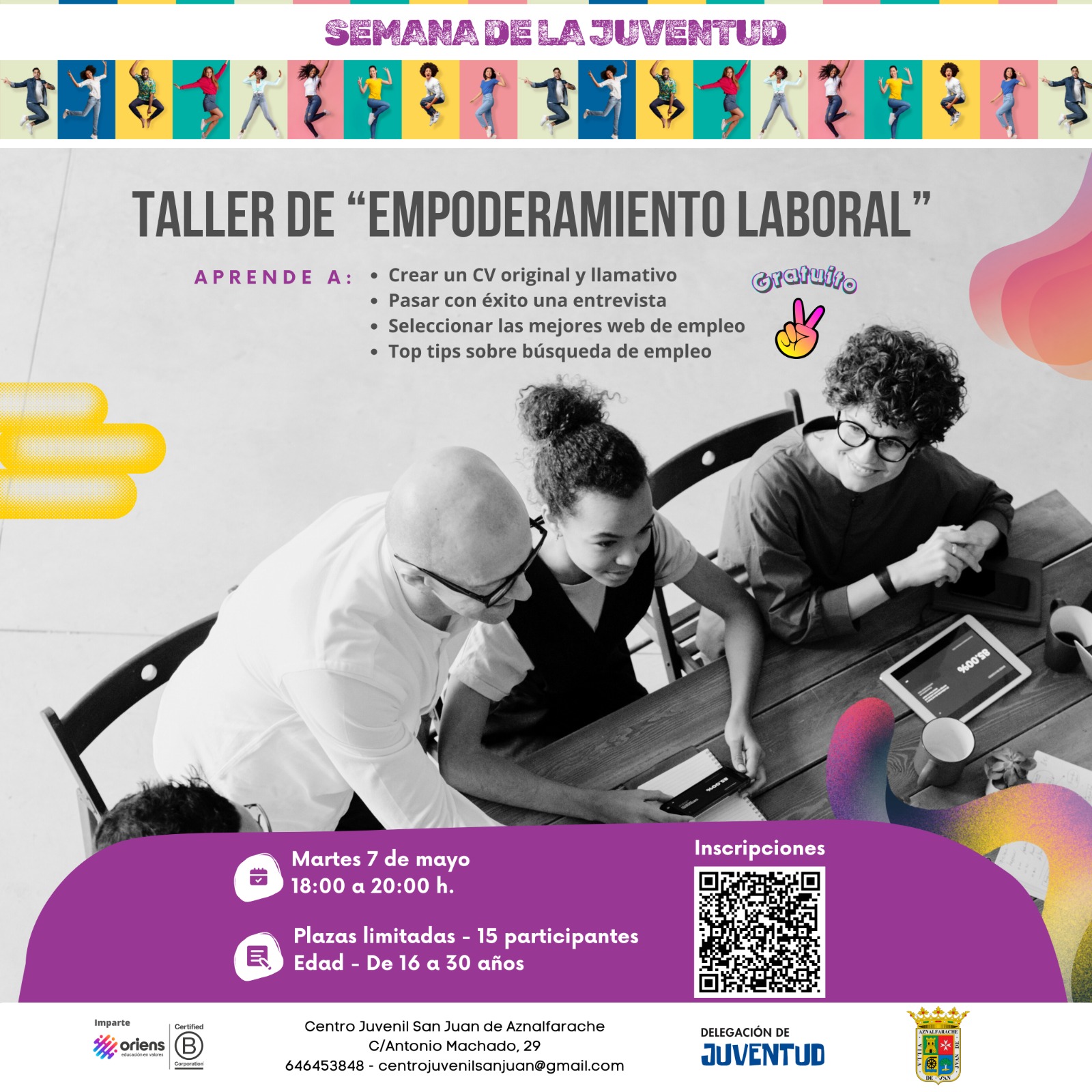- Taller de Empoderamiento Laboral: cv, entrevistas, web y top tips. Una propuesta para disponer de herramientas en la búsqueda de empleo. Con inscripción previa. Dirigido a jóvenes de 16 a 30 años. En el Centro Juvenil, de 18:00 a 20:00 horas.