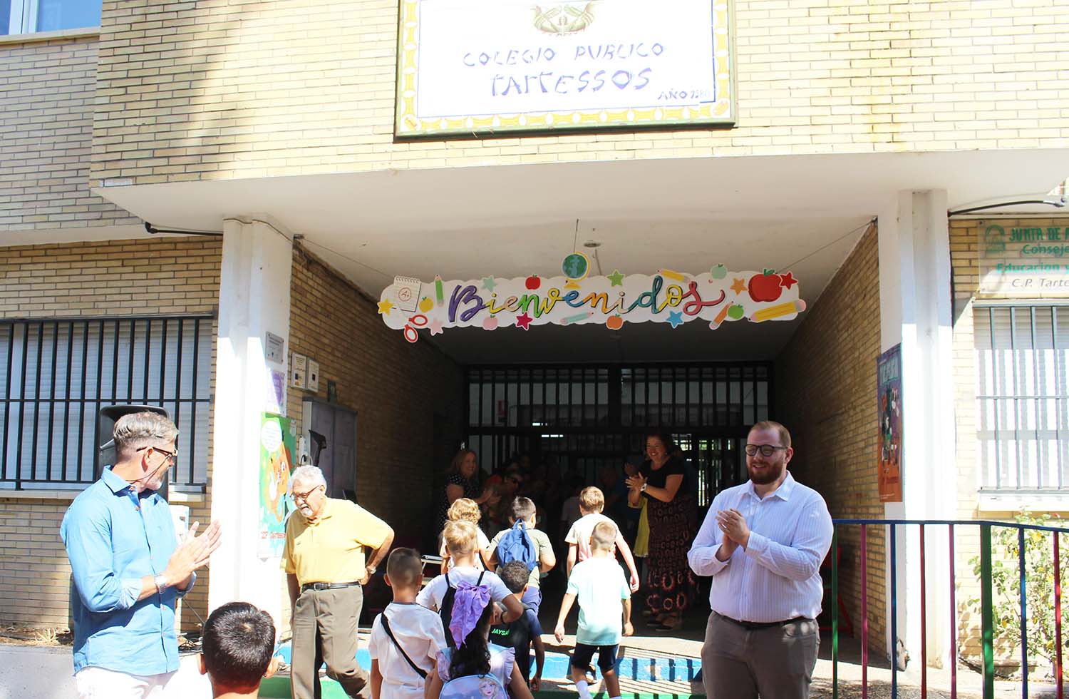 A las 12:00 horas se abría la cancela del CEIP Tartessos y su director, Manuel Ramos, dirigía unas palabras al alumnado y a las familias de este centro educativo. «Por fin llegó el día, bienvenidos a vuestro cole que, para nosotros, es el mejor de todos y así tenemos que sentirlo tanto los profesores como nuestros escolares y sus padres y madres» expresó el director, que agradeció la presencia del delegado de Comunicación, Francisco José Carrasco, en este primer día de clase. La vuelta al cole en el colegio de la barriada de Guadalajara se ha vivido como una autética fiesta: música, baile, aplausos y alfombra roja para recibir a los escolares. Los profesores y profesoras han formado un pasillo en la entrada del centro para acoger a su alumnado en este primer dia.