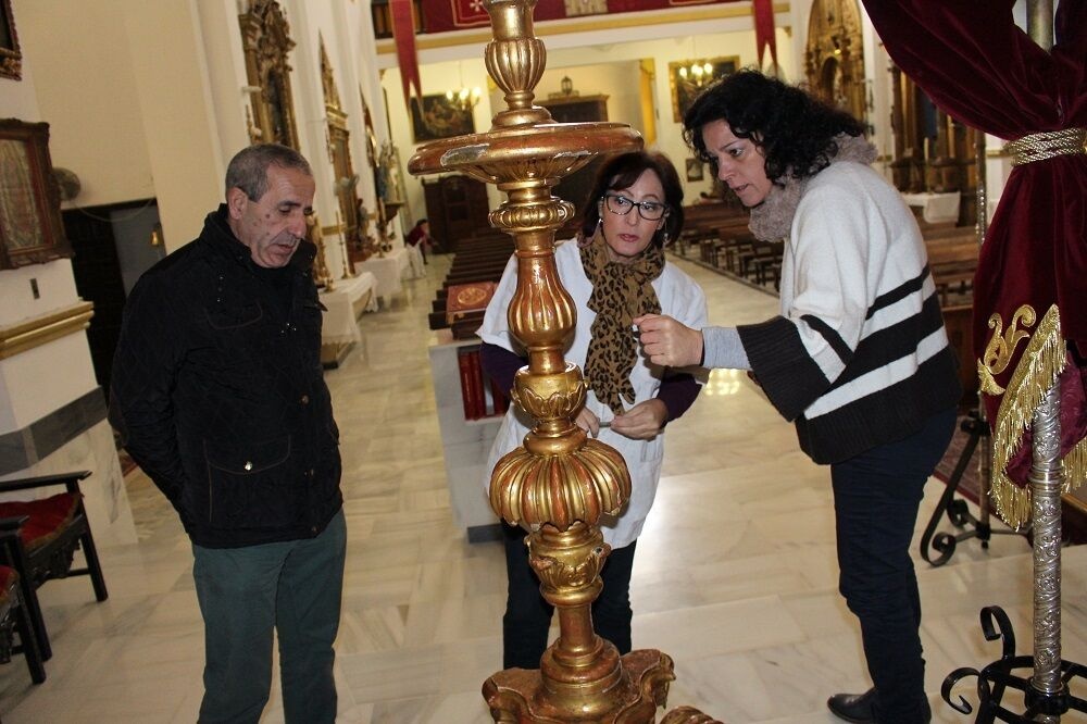 Una capa pluvial del siglo XIV, dos ángeles candeleros del Barroco, una cruz de altar del siglo XVIII, blandones y faroles son algunas de las piezas eclesiásticas que se van a exponer en la parroquia de San Juan Bautista con motivo del Año Jubilar de la Hermandad. Se trata de enseres cedidos por la Diputación Provincial de Sevilla y que han sido sometidos a un tratamiento de conservación de urgencia del que se ha hecho cargo el Ayuntamiento de San Juan de Aznalfarache.