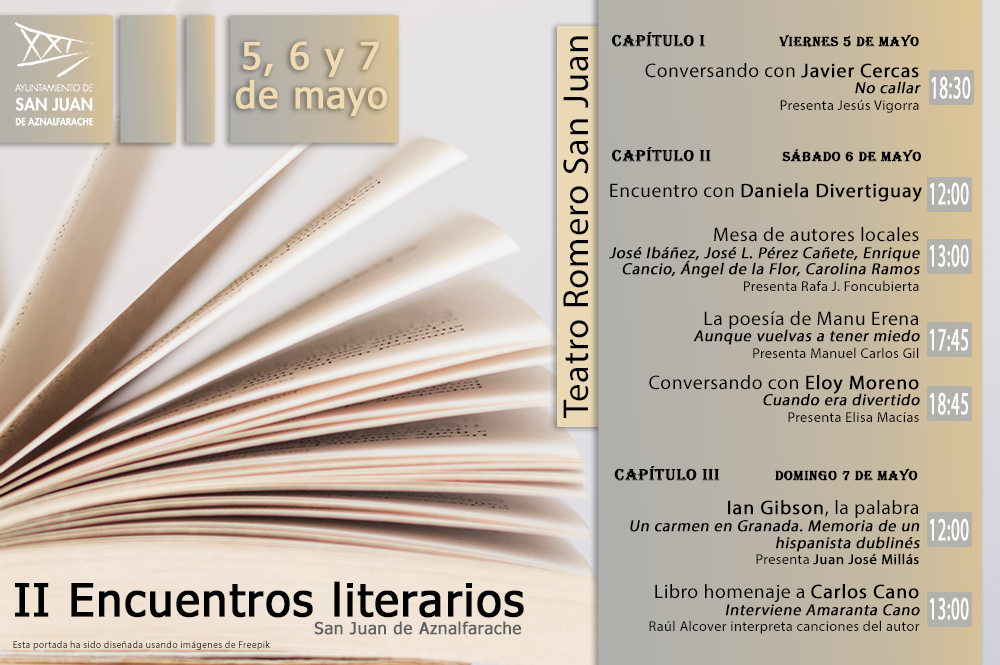 Javier Cercas, Eloy Moreno, Ian Gibson o Daniela Divertiguay compartirán unas horas con los lectores de San Juan durante el fin de semana de 5 al 7 de mayo. Las jornadas tendrán lugar en el Teatro Romero San Juan e incluyen además la presencia de Manu Erena, la presentación de un libro de homenaje a Carlos Cano y una mesa en la que participarán autores de San Juan de Aznalfarache.