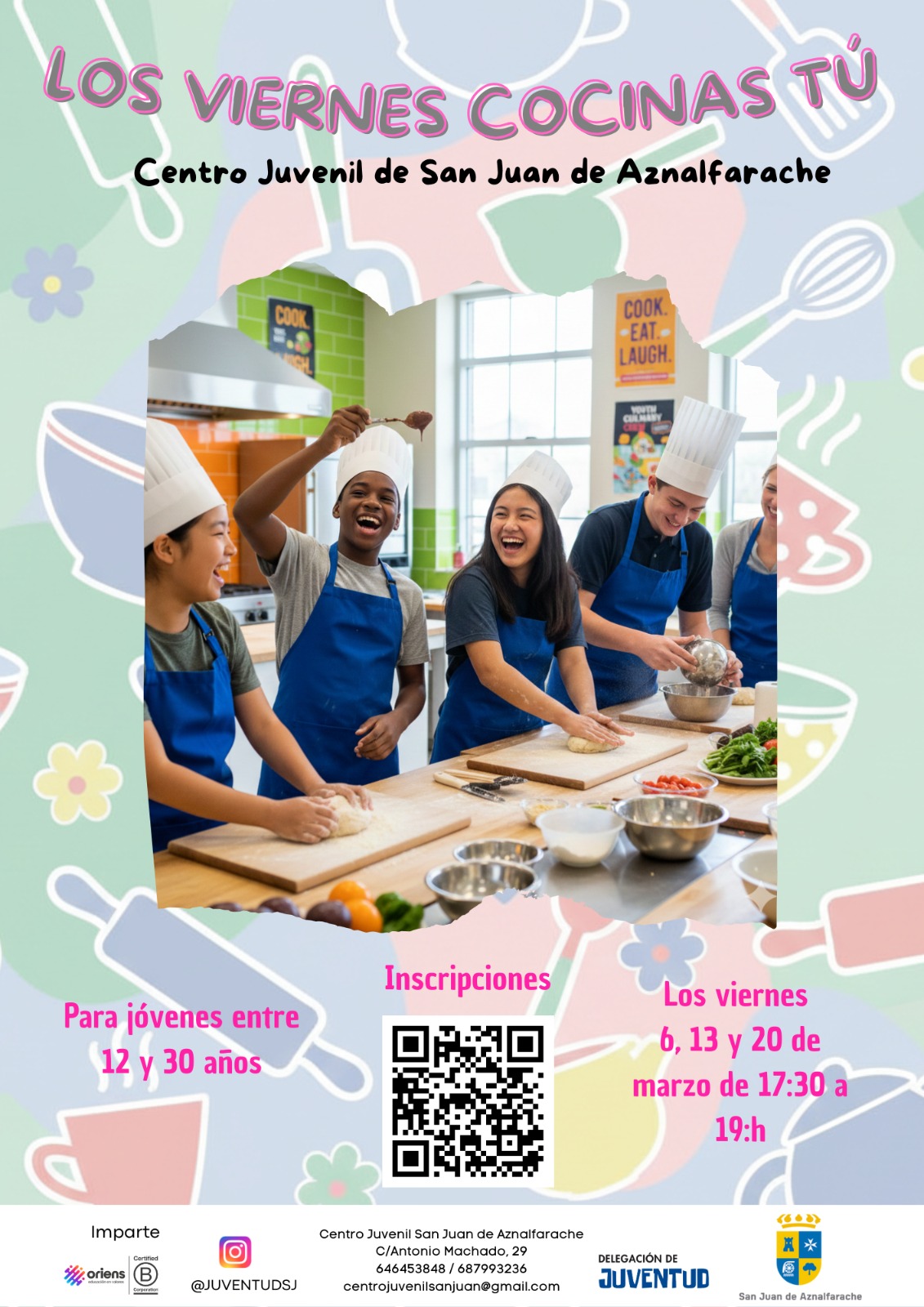 De nuevo apostamos por ofreceros un curso de cocina, esta vez durante tres viernes del mes de marzo. Ya sabemos que es una de las propuestas que más os divierte. Se trata de una propuesta que desarrollaremos en el Centro Juvenil. Tres viernes del mes de marzo. Una sesión práctica y divertida para que, en muy poco tiempo, aprendamos los rudimentos del arte de la cocina y seamos capaces de hacer platos de forma sencilla y, al tiempo, apostando por el cuidado de nuestra salud y, como siempre, trabajando y compartiendo en grupo.
