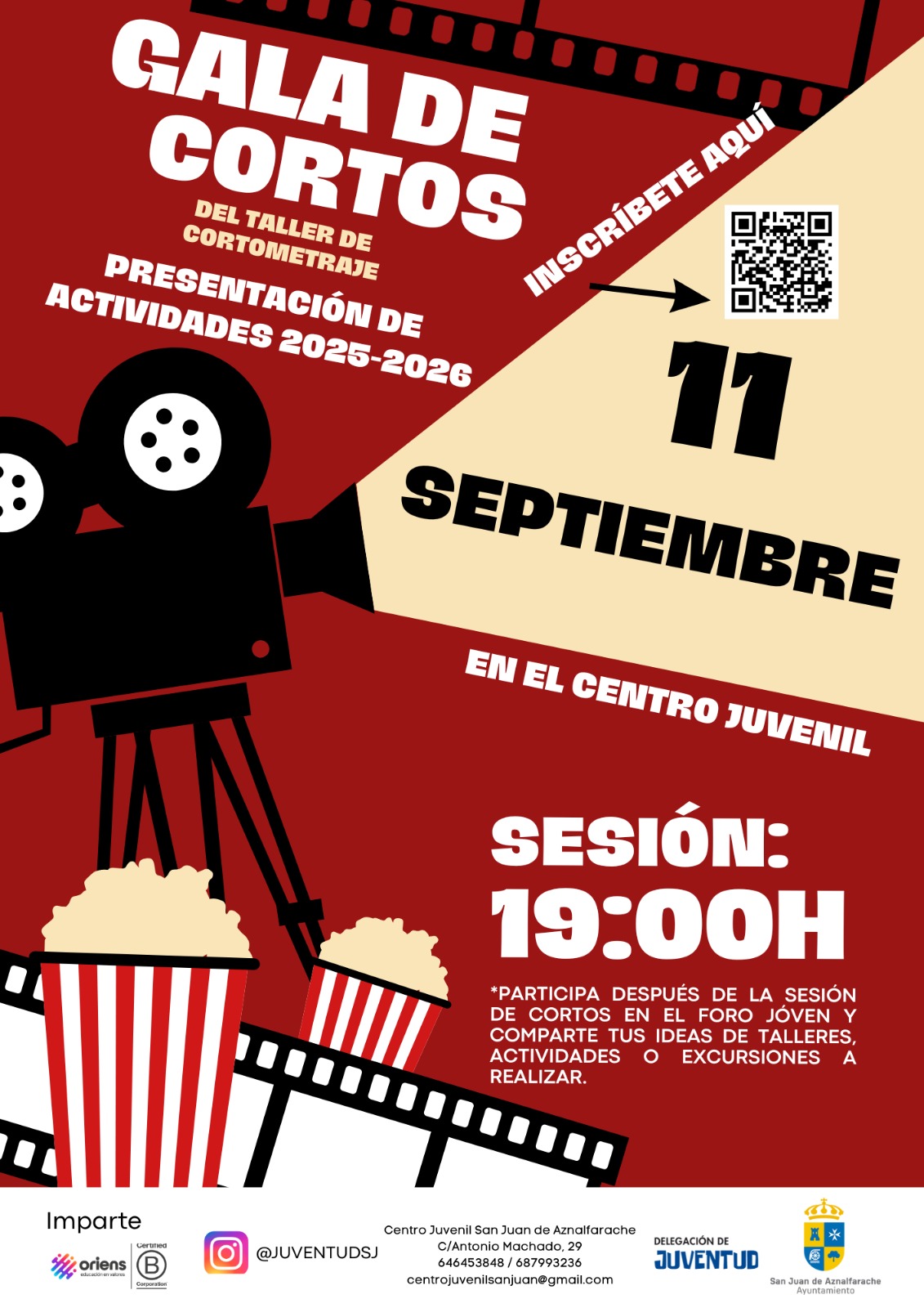 El miércoles 11 de septiembre a las 19:00, el Centro Juvenil de San Juan acoge la Gala de clausura del Taller de Cortos, una cita para disfrutar del talento joven y del cine hecho desde dentro.