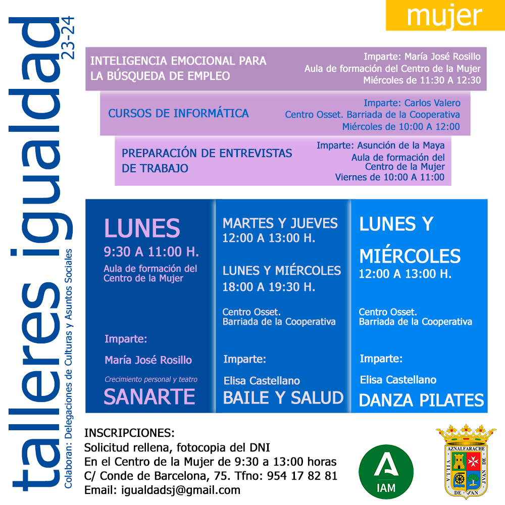 Todos los cursos organizados por la delegación de Igualdad del Ayuntamiento de San Juan de Aznalfarache son gratuitos y están dirigidos a mujeres adultas. La inscripción se puede realizar en el centro de la Mujer de 9:30 a 13:00 horas o enviando la solicitud rellena a igualdadsj@gmail.com Las solicitudes se pueden descargar en la información de cada uno de los talleres.