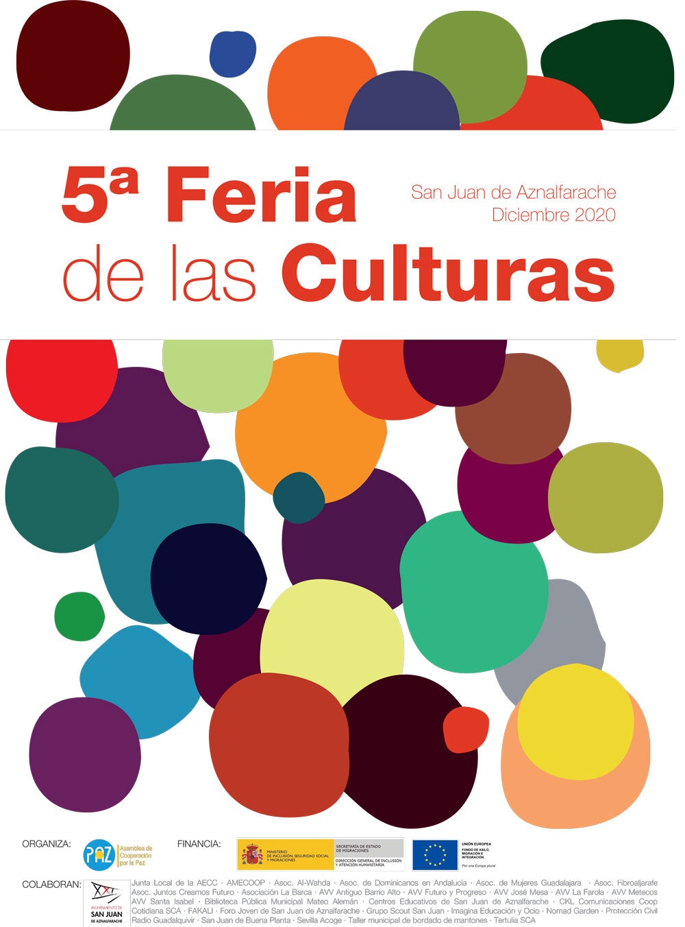 El trabajo a favor de la diversidad cultural y el rechazo al discurso del odio imprime carácter por quinto año a la Feria de las Culturas de San Juan de Aznalfarache, aprovecha los recursos multiculturales de los que dispone la localidad para convertirse en un espacio de encuentro, en esta edición más virtual que físico debido a las restricciones que provoca la normativa frente al Covid_19. Arte callejero, educación y sensibilización online, una gymkhana de realidad aumentada y unas serie de acciones de diversidad cultural y difusión conforman los cuatro ejes de este encuentro multicultural que, organizado por Asamblea de Cooperación por la Par (ACPP), se desarrollará entre 14 y el 20 de diciembre en la localidad.