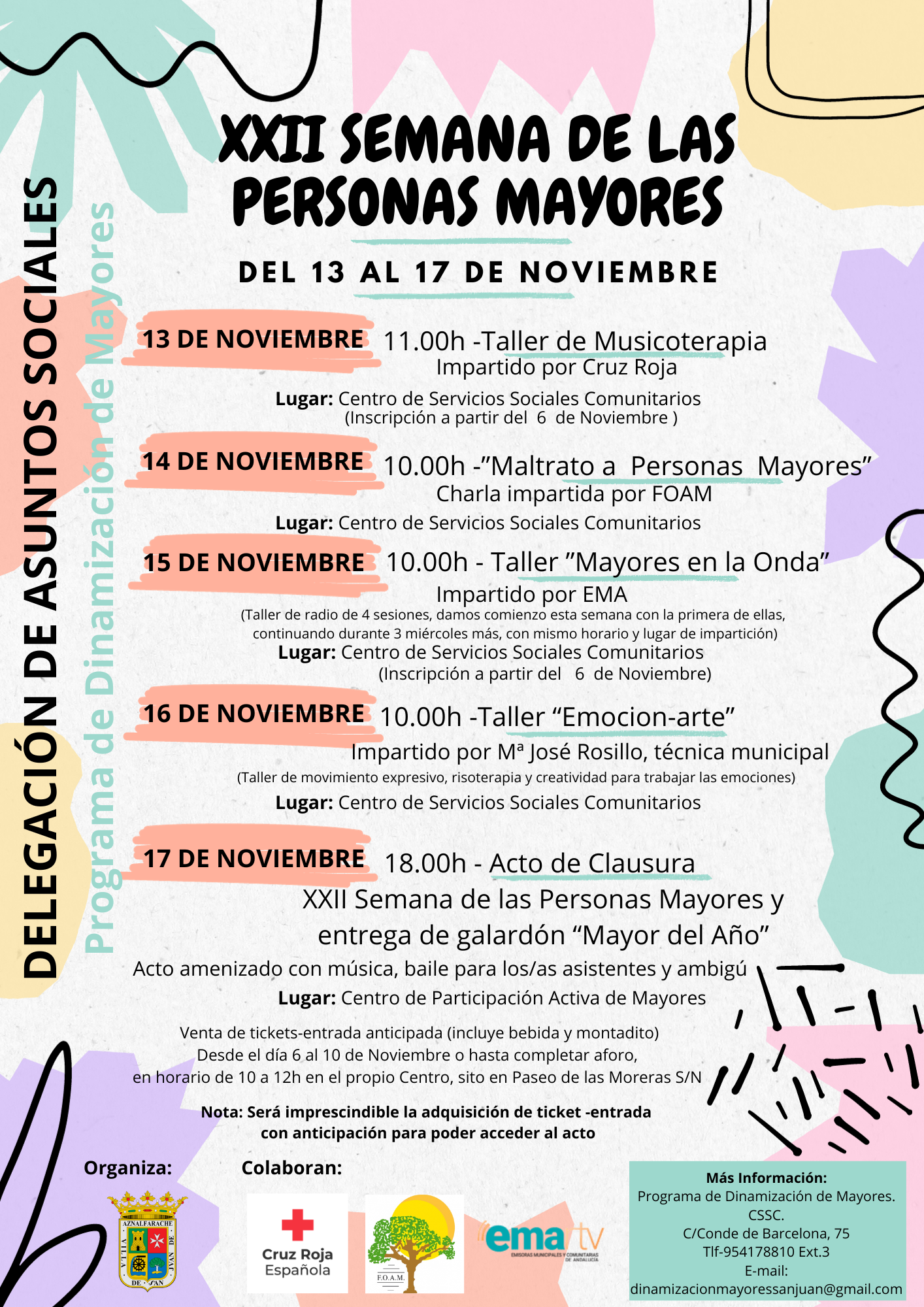 El plazo de inscripción en las actividades estará abierto del 6 al 10 de noviembre en el Centro de Servicios Sociales. Para la fiesta de clausura será necesario comprar los tiques/entradas durante la semana anterior en el centro de Participación activa (paseo de las Moreras).