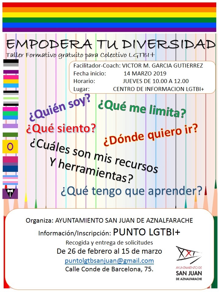 La información relativa al taller «Empodera tu diversidad» y las solicitudes de inscripción se puede recoger en el Punto LGTBI+ de San Juan de Aznalfarache. El curso comenzará el 14 de marzo.