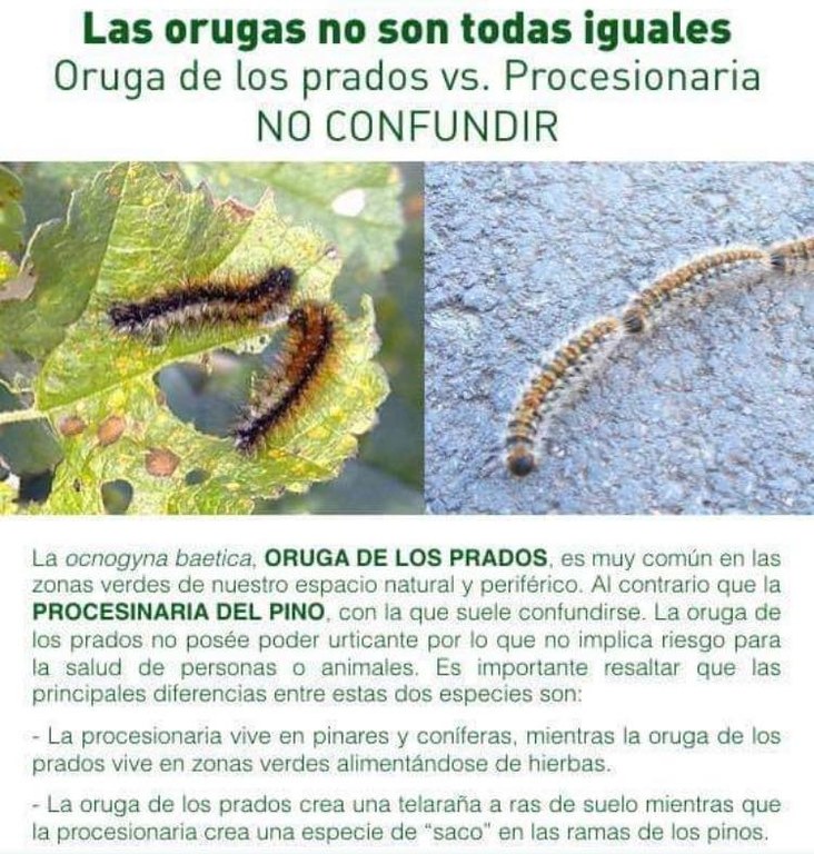 Como cada año, entre finales de enero y principios de febrero, comienzan a aparecen en parques y jardines y en sus zonas aledañas orugas comunes, propias del clima mediterráneo, que causan alarma entre la población por su enorme parecido con la oruga procesionaria, que se crían en los pinos y con incidencias para la salud de las personas e incluso graves para las mascotas. Diferencias entre ambas:
