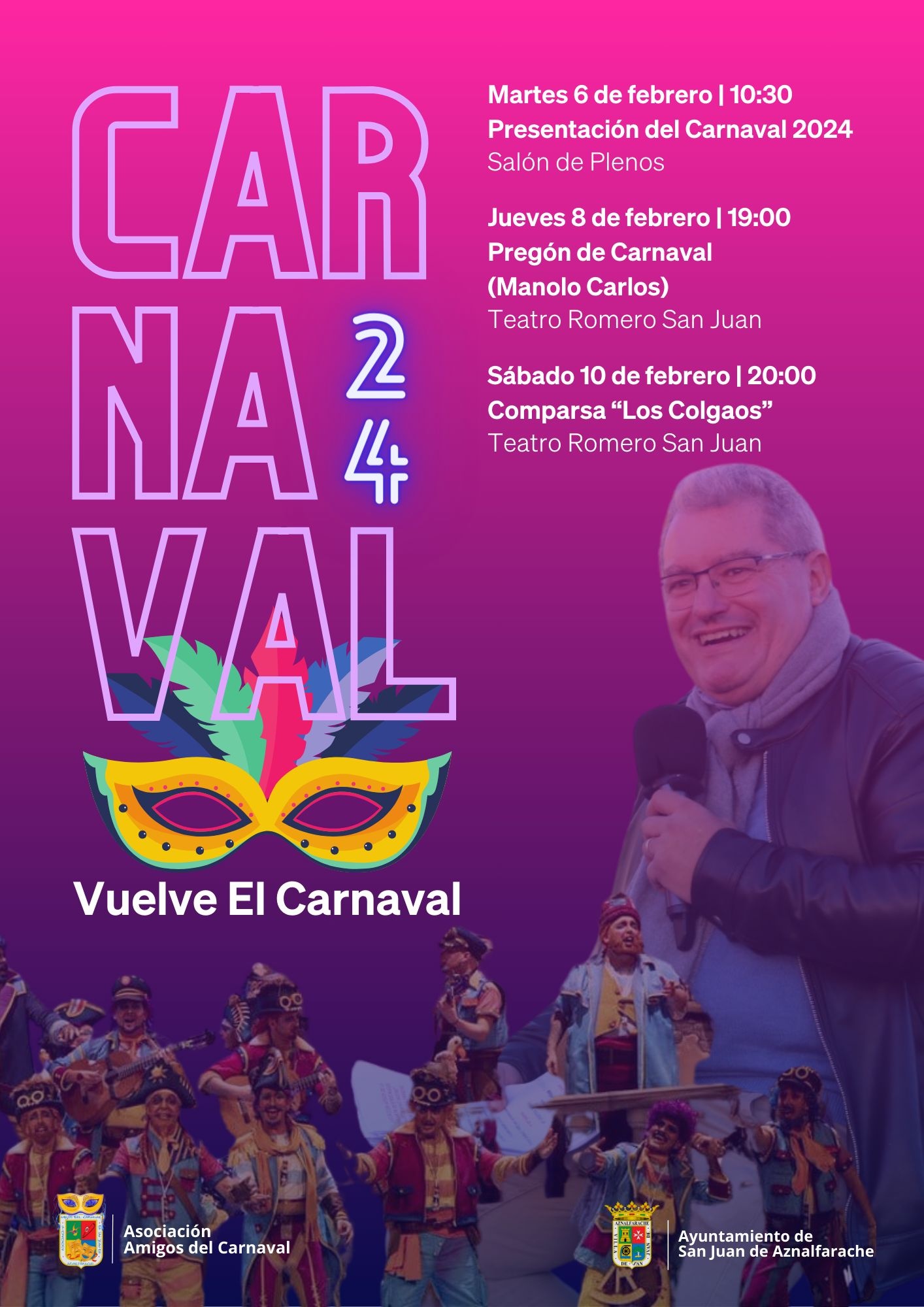 Desde la Delegación de Culturas del Ayuntamiento de San Juan en colaboración con la Asociación Amigos del Carnaval se ha diseñado un amplio programa de actividades para llenar de papelillos y serpentinas los primeros días del mes de febrero.