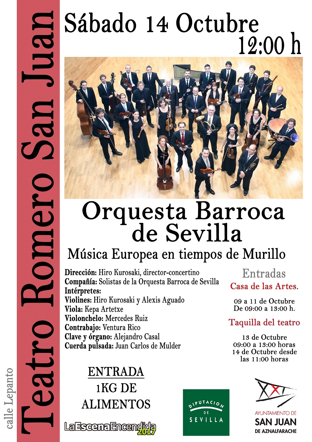 El teatro Romero San Juan acoge este sábado 14 de octubre el concierto de la Orquesta Barroca de Sevilla titulado «Música europea en tiempos de Murillo». Este espectáculo se incluye dentro de la programación de la Escena Encendida de la Diputación provincial de Sevilla.