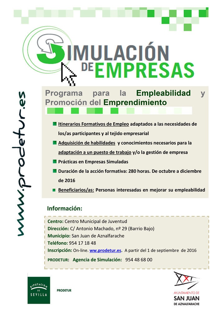 El curso forma parte del Programa de Simulación Empresarial para la Empleabilidad y Promoción del Emprendimiento de Prodetur y se coordina en San Juan de Aznalfarache a través de la delegación de Formación