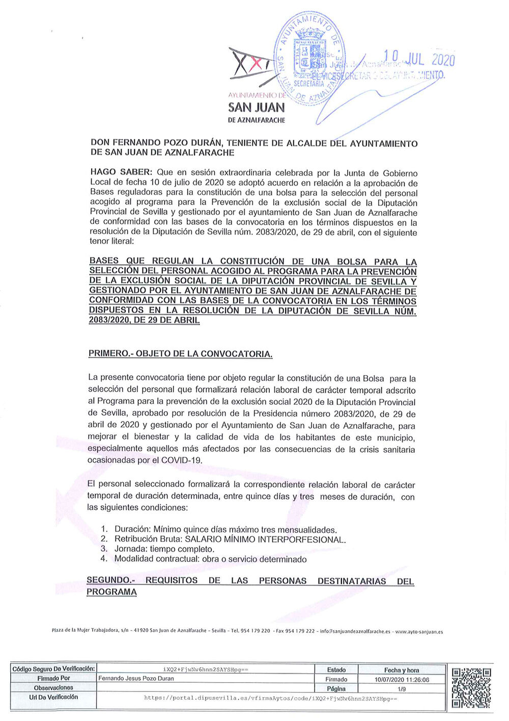 Las personas interesadas en participar en la bolsa de selección deberán cumplir una serie de requisitos como estar empadronados/as en San Juan de Aznalfarache, encontrarse en situación de desempleo y no superar el umbral de renta familiar que se indica en las bases. Las bases indican igualmente la documentación que se debe aportar al presentar la solicitud. La bosal de selección tendrá vigencia hasta el 31 de diciembre de 2020.
